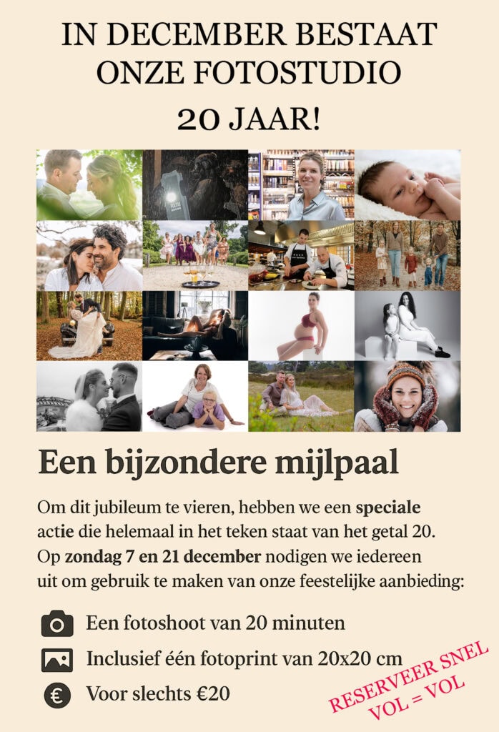 𝗜𝗻 𝗱𝗲𝗰𝗲𝗺𝗯𝗲𝗿 𝗯𝗲𝘀𝘁𝗮𝗮𝘁 𝗼𝗻𝘇𝗲 𝗳𝗼𝘁𝗼𝘀𝘁𝘂𝗱𝗶𝗼 𝟮𝟬 𝗷𝗮𝗮𝗿! Een bijzondere mijlpaal waar we met trots en dankbaarheid bij stilstaan. Al twee decennia lang mogen we de mooiste momenten, emoties en verhale...